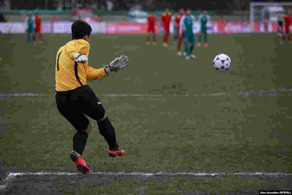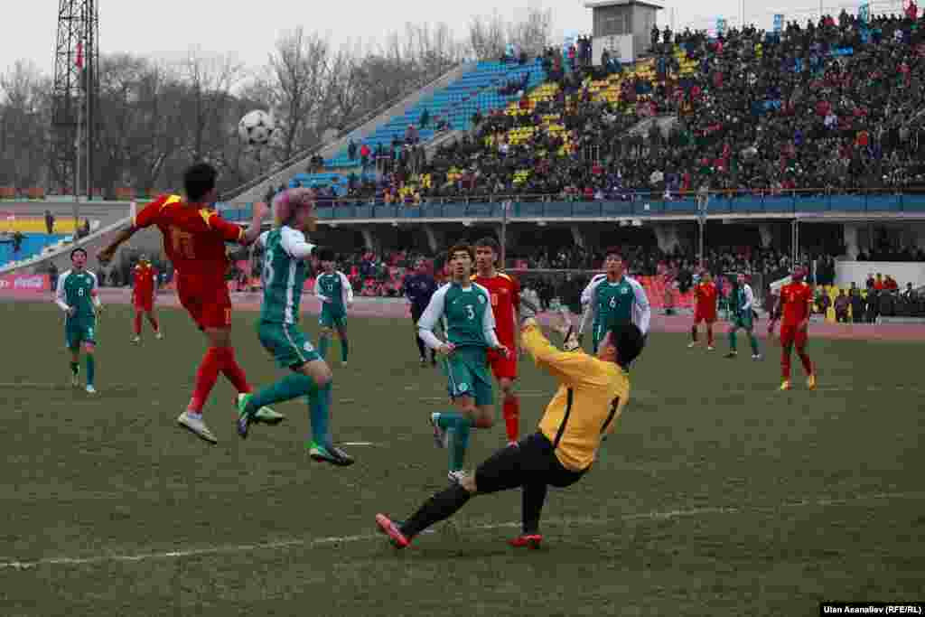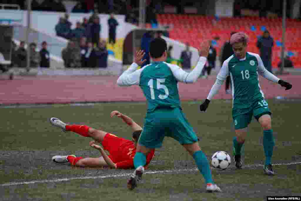 Бишкектеги Дөлөн Өмүрзаков атындагы стадиондо Азия футбол Конфедерациясынын чакырыгы кубогу үчүн футболдук мелдеште Кыргызстандын курама командасы Макаонун курама командасын 1:0 эсебинде утуп алды. Оюндун биринчи таймында 45-мүнөттө кыргызстандык футболчу Дэвид Тетте өзгөчөлөнүп, макаолуктардын дарбазасына гол киргизди. (Сүрөттөр Улан Асаналиевдики)