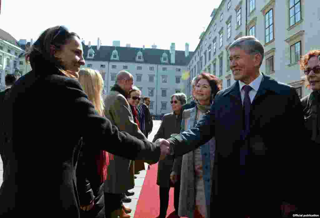 Бүгүн Венада Кыргызстандын президенти Алмазбек Атамбаев Австриянын федералдык президенти Хайнц Фишер менен жолугушту. Фишер Атамбаев баштаган кыргыз делегациясын Хофбург Ак сарайынын алдындагы парад аянтында жубайы жана расмий бийлик өкүлдөрү менен бирге тосуп алды.