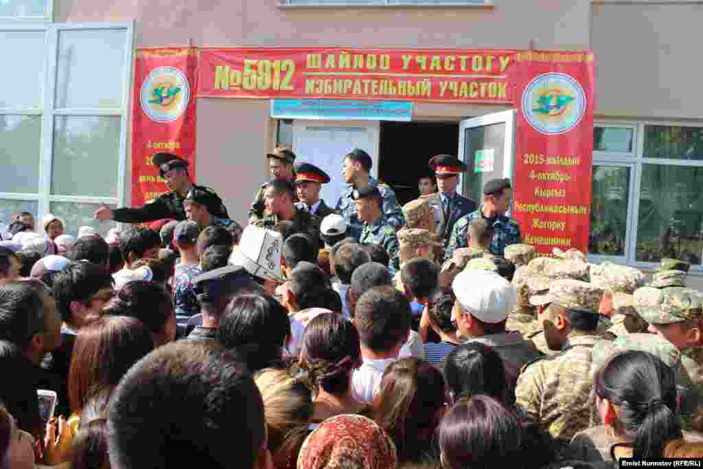 Оштогу №5912 кошумча шайлоо участогуна келген жоокерлер кезектин көптүгүнөн улам добуш бере албай кетишти. Алар келип, шайлоо участкасына кезексиз кире башташкан учурда кезек күтүп турган эл нааразы болуп, кууп жибергенин "Азаттыктын" аймактагы кабарчысы билдирүүдө.