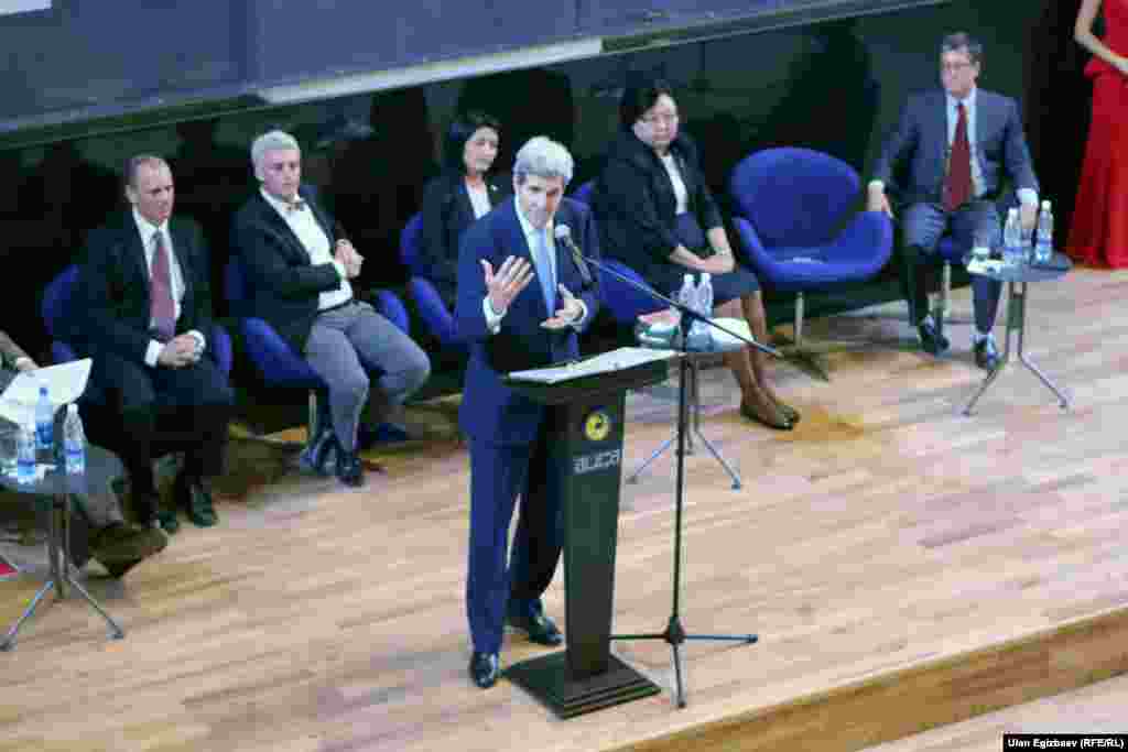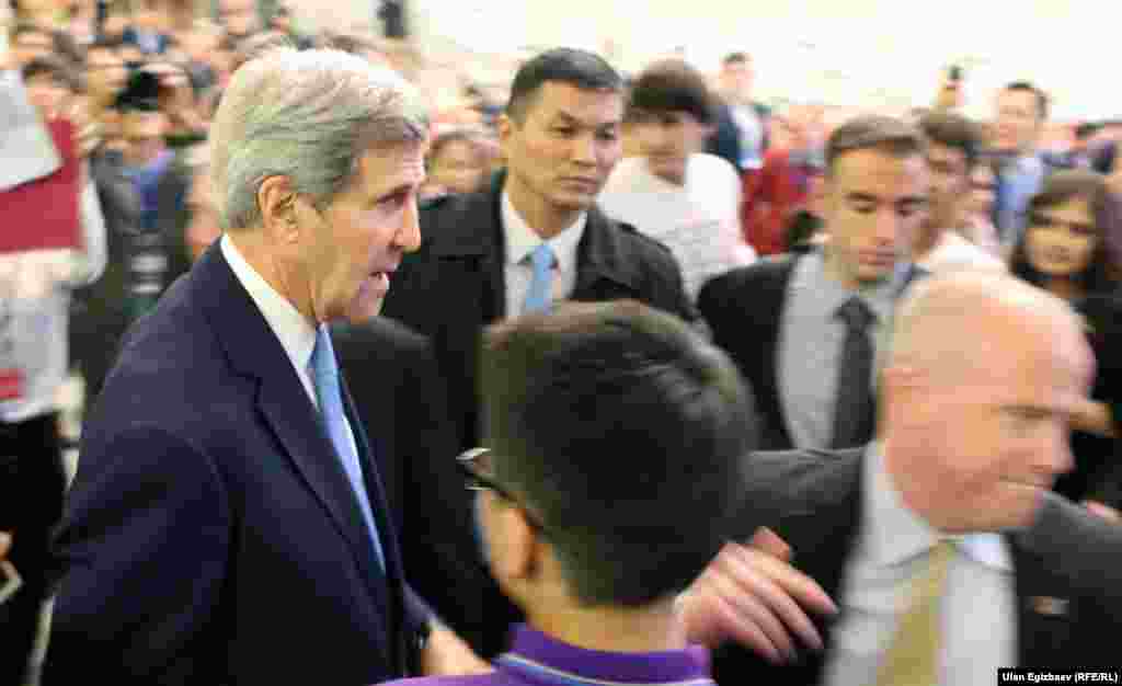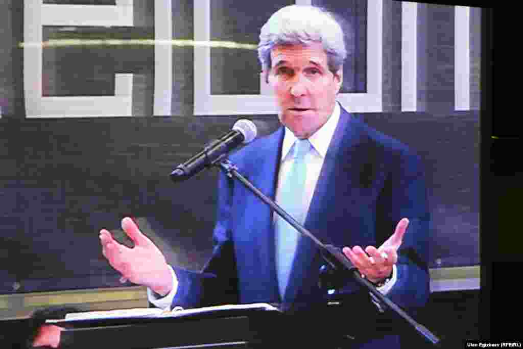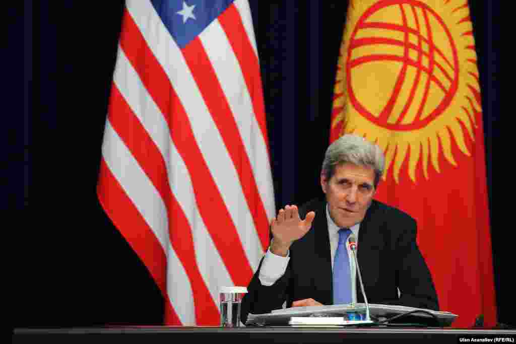 Жон Керри Борбор Азия республикаларын кыдыруусун бүгүн Бишкектен баштады. Алгач ал АКШнын Кыргызстандагы элчилигинин жаңы имаратынын ачылышына катышты. ​Андан соң президент Алмазбек Атамбаев менен жолукту. Жолугушуудан кийин маалымат жыйында эки тараптуу сүйлөшүү ачык-айкын өткөнүн, бардык маселелер боюнча пикир алышуу болгонун билдирди. Керри Кыргызстанды парламенттик шайлоону ийгиликтүү өткөрүп алышы менен куттуктады.​ АКШ мамкатчысы бул жолугушуулардын кийин Борбор Азиядагы Америка университетинин жаңы имаратынын ачылышына катышып, студенттер менен жолукту.