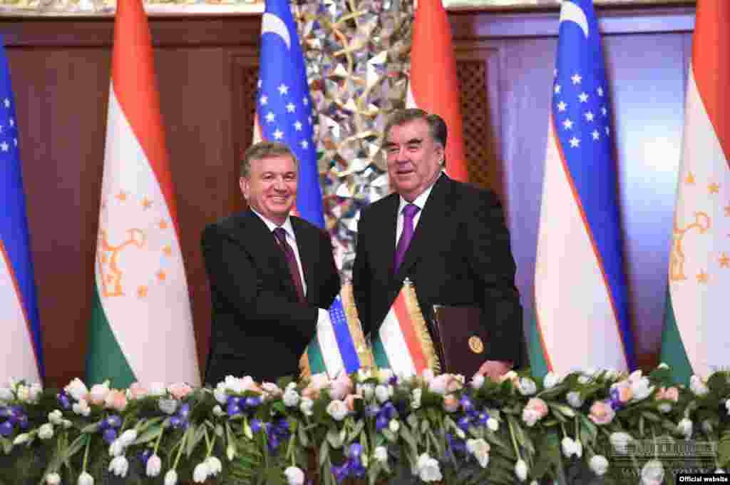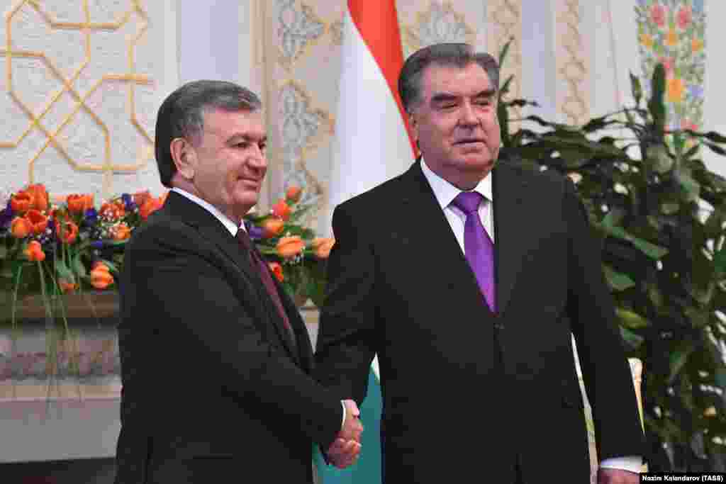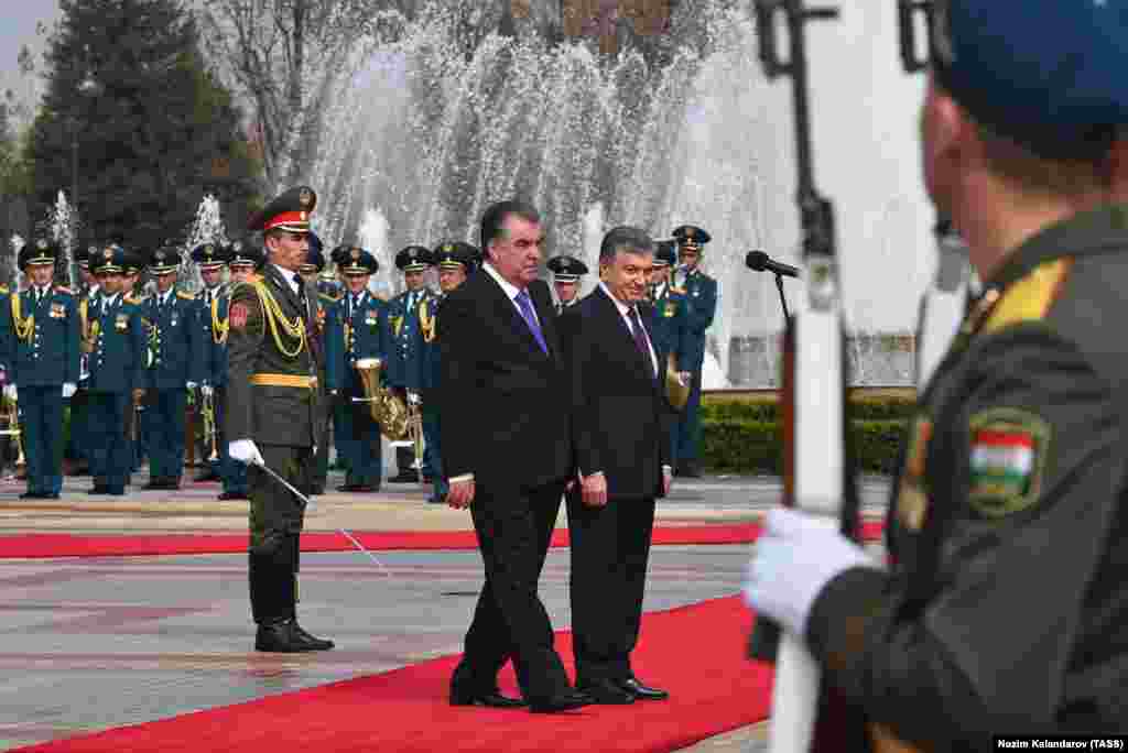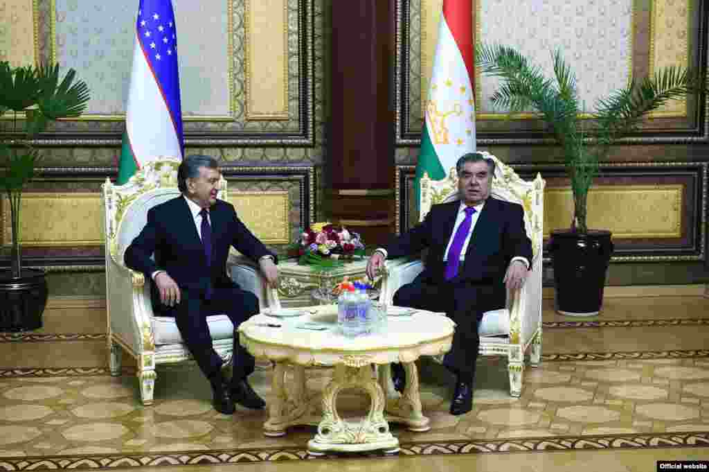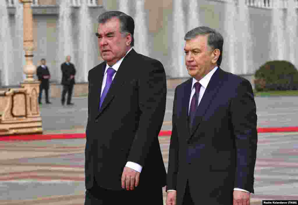 Дүйшөмбүнүн эл аралык аэропортунда өзбек лидерин Тажикстандын президенти Эмомали Рахмон башында турган расмий адамдар тосуп алышты.