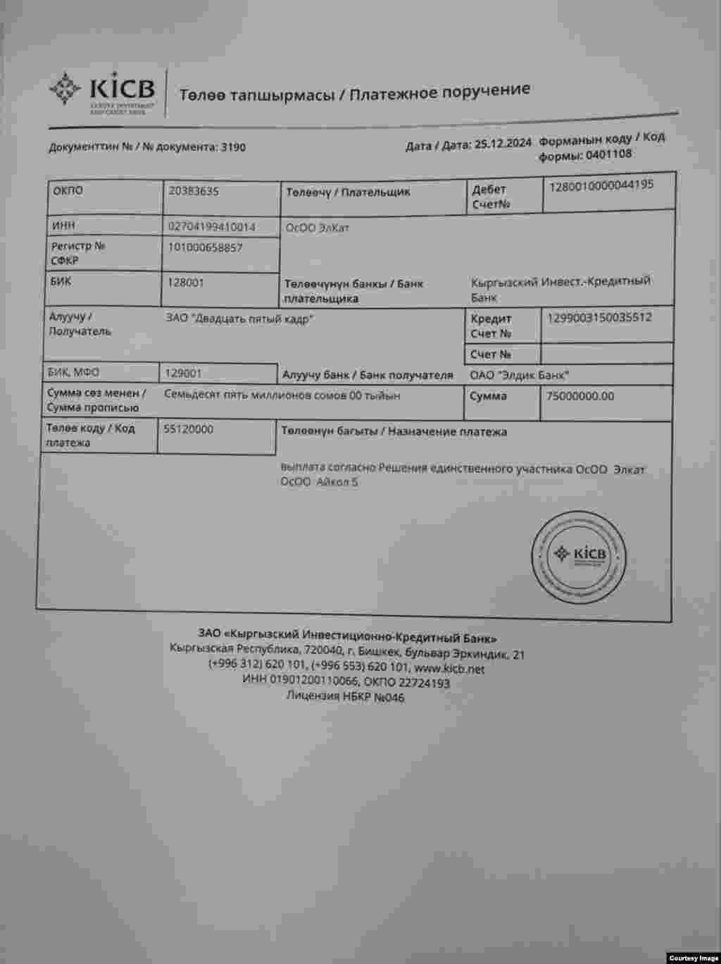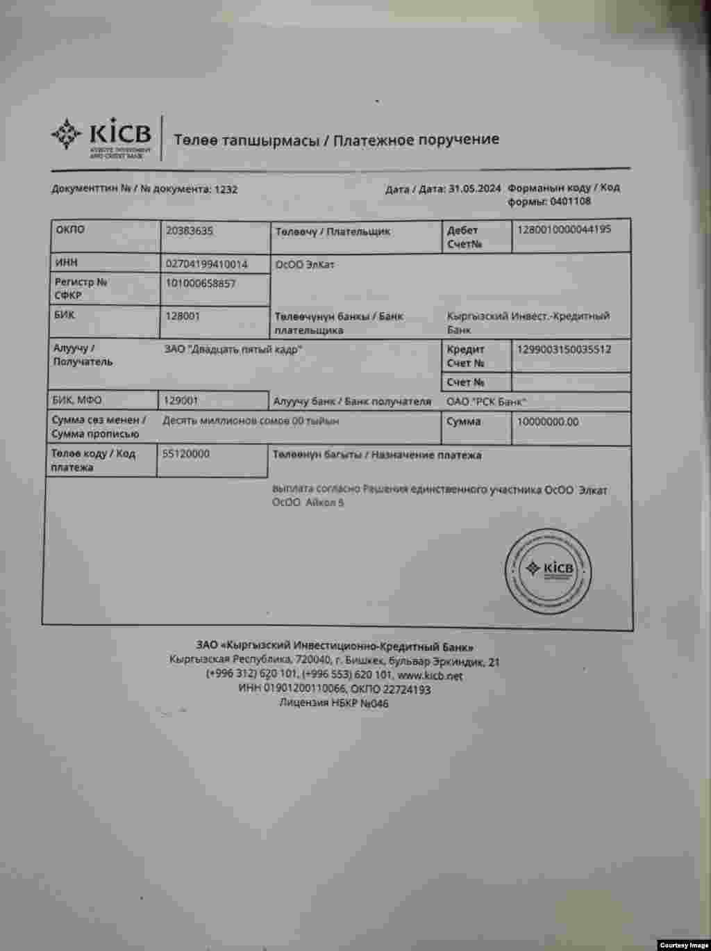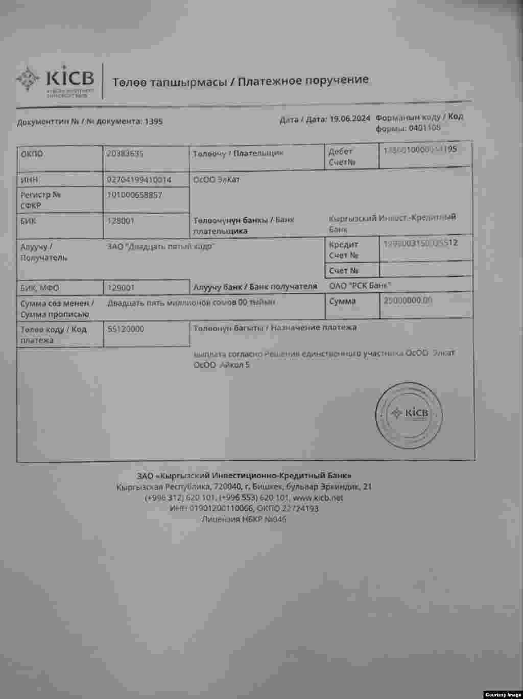"Айкөл-5" компаниясынын "25-кадр" компаниясына акча которууларынын дүмүрчөктөрү
