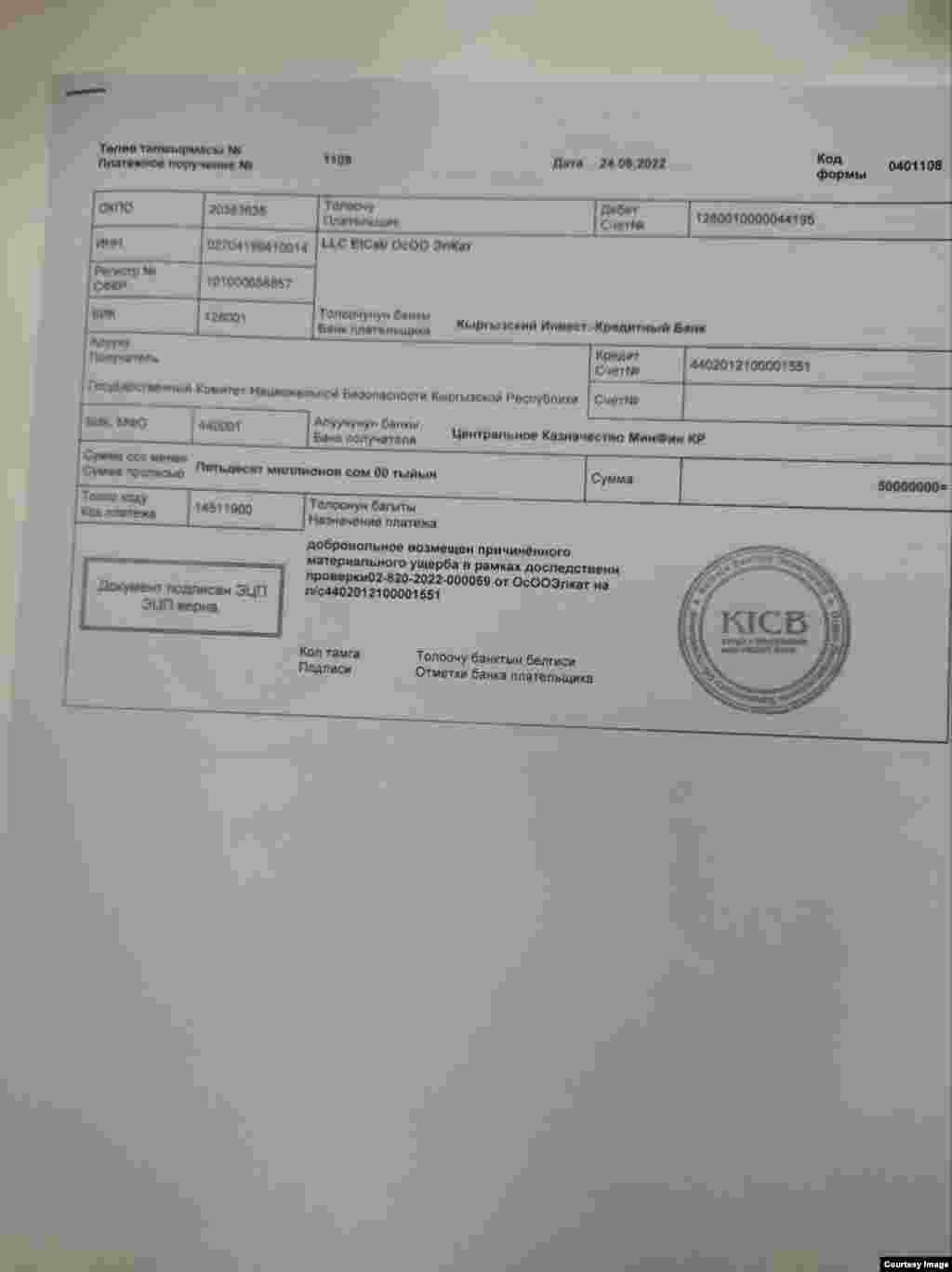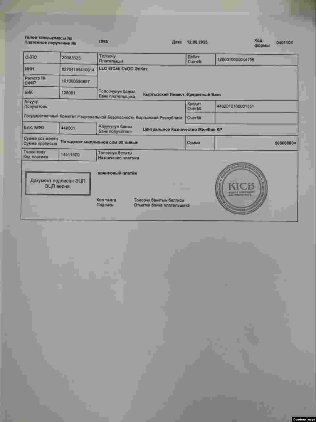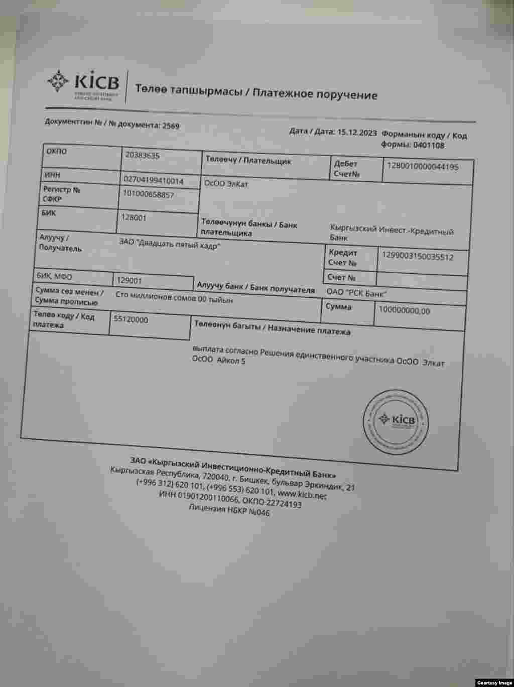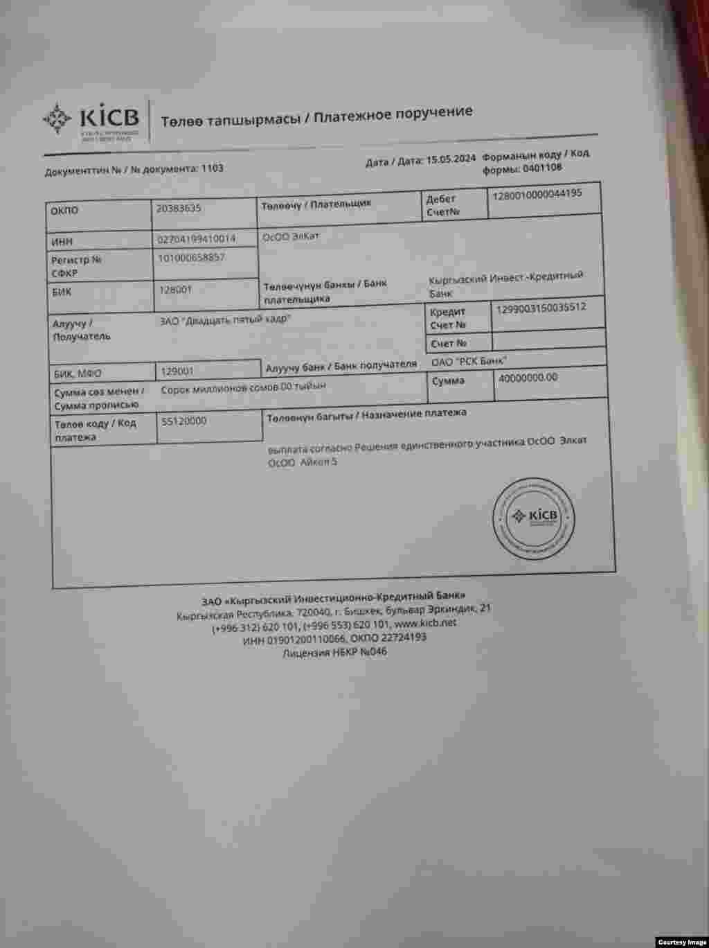 "Айкөл-5" компаниясынын "25-кадр" компаниясына акча которууларынын дүмүрчөктөрү