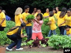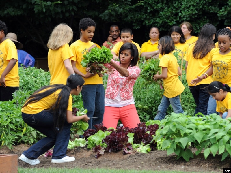 АКШнын канайымы Мишель Обама Ак Үйдүн короосунда 5-класстын окуучулары менен. 16-июнь 2009-ж.