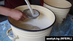 - Көчөлөрдө, боз үйлөрдө сатып жүрүп акыры ушул жерден имаратты ижарага алдым. 7-8 жылдан бери иштейм. Кирешемди айта албайм, балдарымдын окуу акысын төлөп жатабыз, кыскасы жетип жатат. Бир литри 80-100 сомдон, күнүнө 500-600 литр сатам. Орусияга ичкени, сатканы алып кеткендер бар.