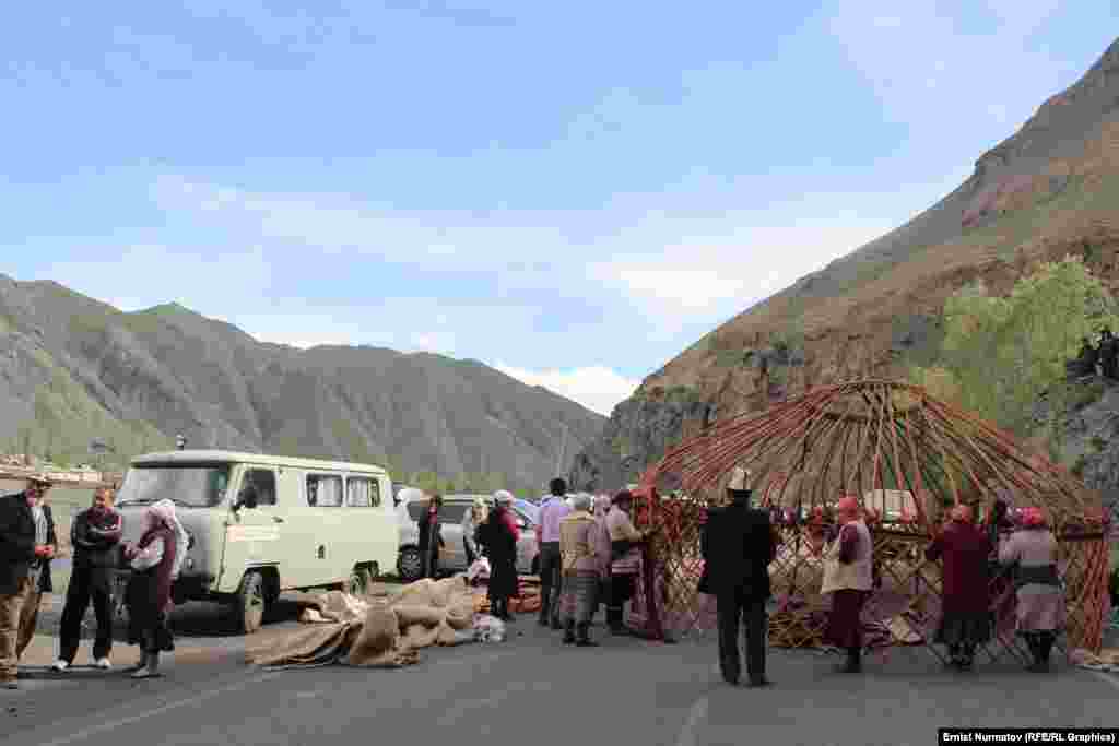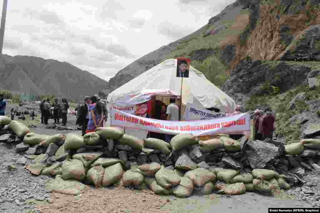 Ош – Эркеч-Там жолунун Сопу-Коргондогу бөлүгүндөгү жолдун ортосуна жана четине төрт боз үй тигилип, 300дөй адам турат. Алар Жогорку Кеңештин депутаты Акматбек Келдибековду үй камагына чыгаруу талабын коюп жатышат. 28-майда алар менен район акими жолугушту, бирок сүйлөшүүлөрдөн эч кандай майнап чыккан жок.