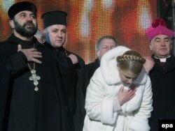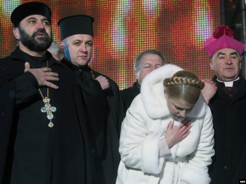 Ошол эле учурда коңшулаш башка аянтта премьер-министр Тимошенко тарапкерлеринин алдына такыр башкача маанайда чыкты. Ондогон сакалчан поптордун курчоосунда Тимошенко элге кайрылып, өлкөнүн биримдиги үчүн сыйынууга чакырды: